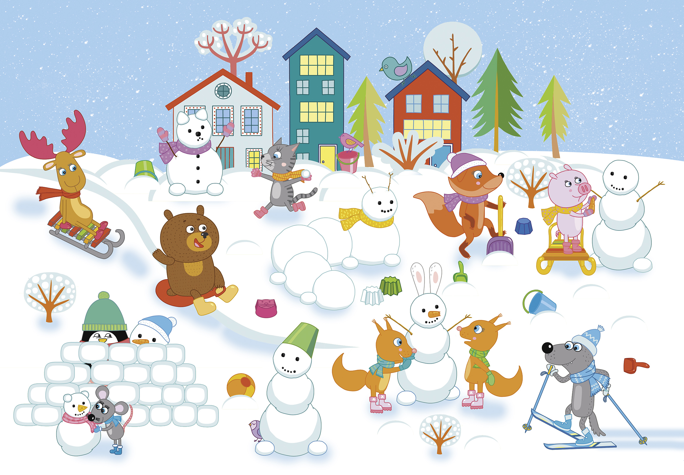 Внимательно посмотрите на картинку вместе с ребенком и попробуйте посчитать снеговиков и ведерки. А еще найдите трех птичек, два одинаковых шарфа и того, кто украл морковку.