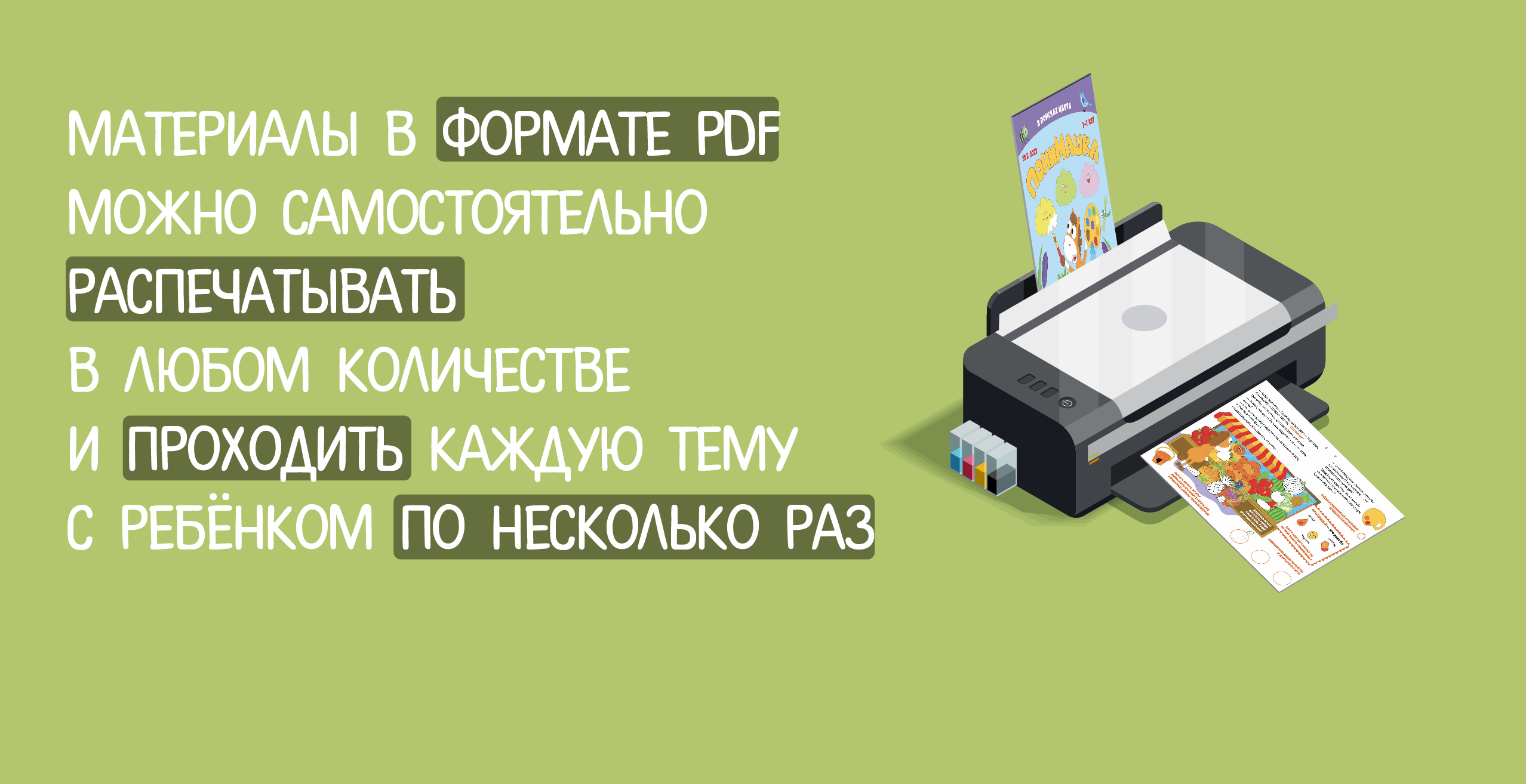 Материалы в формате PDF можно самостоятельно распечатывать в любом количестве и проходить каждую тему с ребёнком по несколько раз. К любой теме можно вернуться позже и снова распечатать задания.