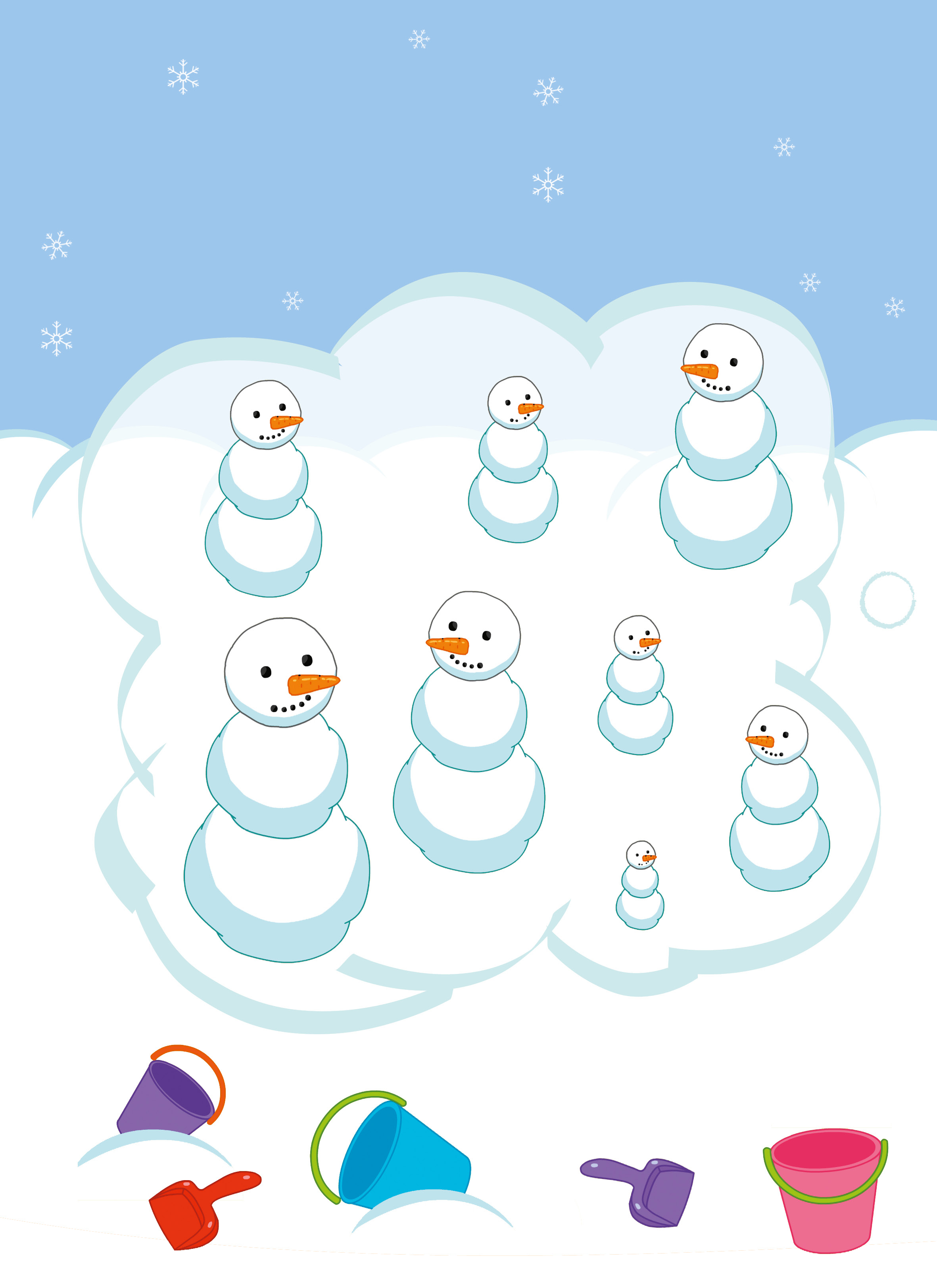 А сегодня наша ПониМашка встретила большую компанию снеговиков. Посмотрите на них внимательно и расставьте по порядку от самого маленького до самого большого.