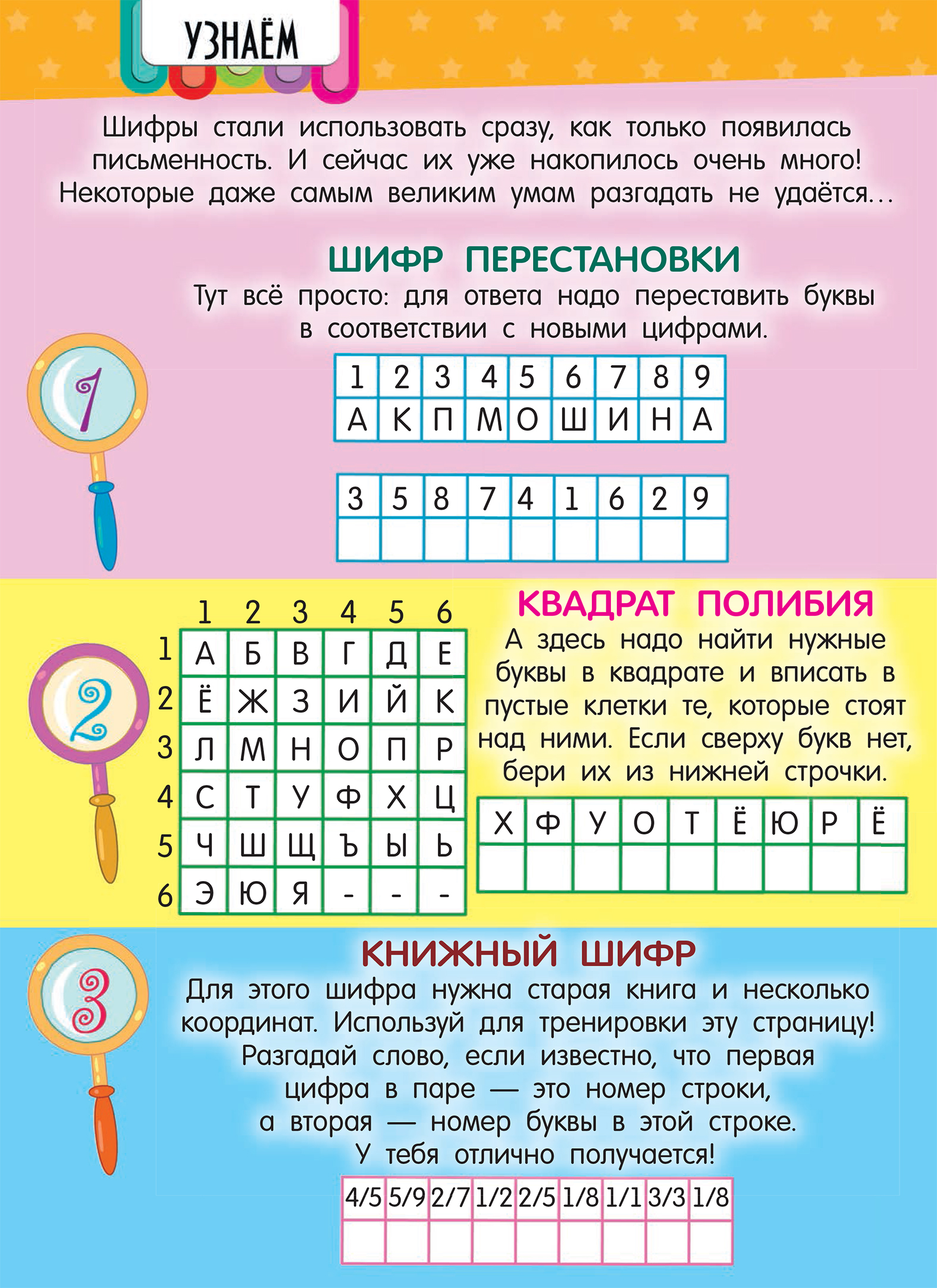 Для этого шифра нужна старая книга и несколько координат. Используй для тренировки эту страницу! Разгадай слово, если известно, что первая цифра в паре — это номер строки, а вторая — номер буквы в этой строке. У вас отлично получается!