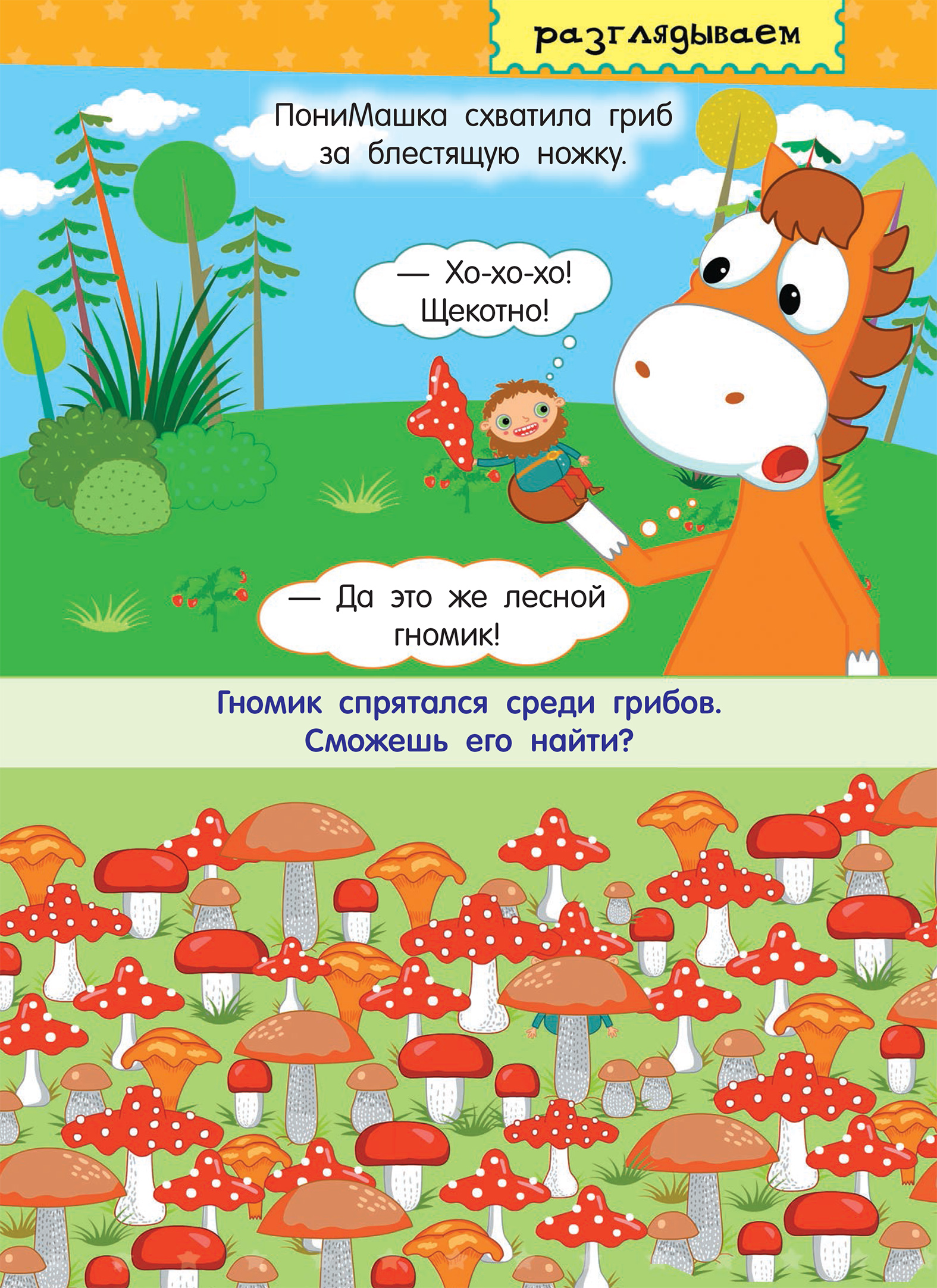 Это простая игра на внимательность для самых маленьких. ПониМашки отправилась в лес, чтобы навестить своего друга Гномика. Но гномик спрятался среди мухоморов. Помогите ПониМашке его найти. Если малыш не может найти гномика сразу, то подскажите ему, куда двигаться. Можно даже поиграть в "горячо-холодно".