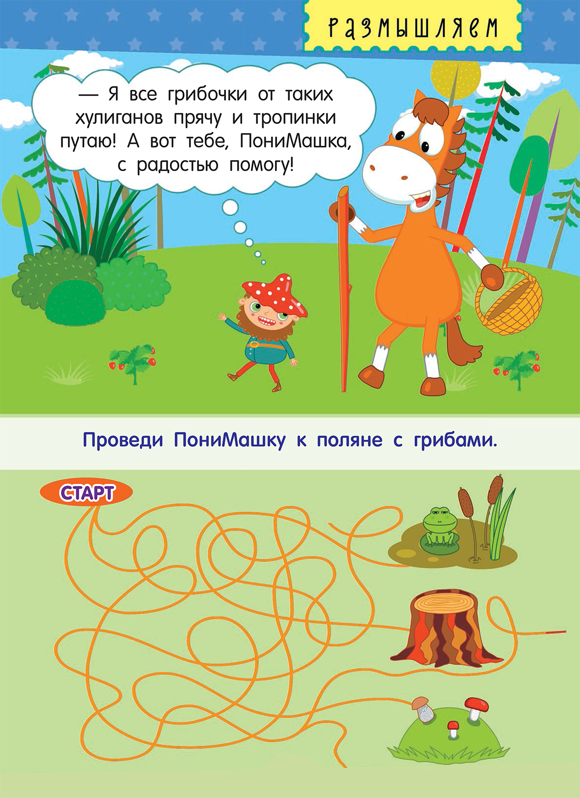 Мы уже много писали о пользе лабиринтов для детей. Что они способствую развитию внимания, логики и усидчивости. А главное, дети их очень любят! Поэтому давайте просто поможем ПониМашки найти дорожку до грибной полянки.