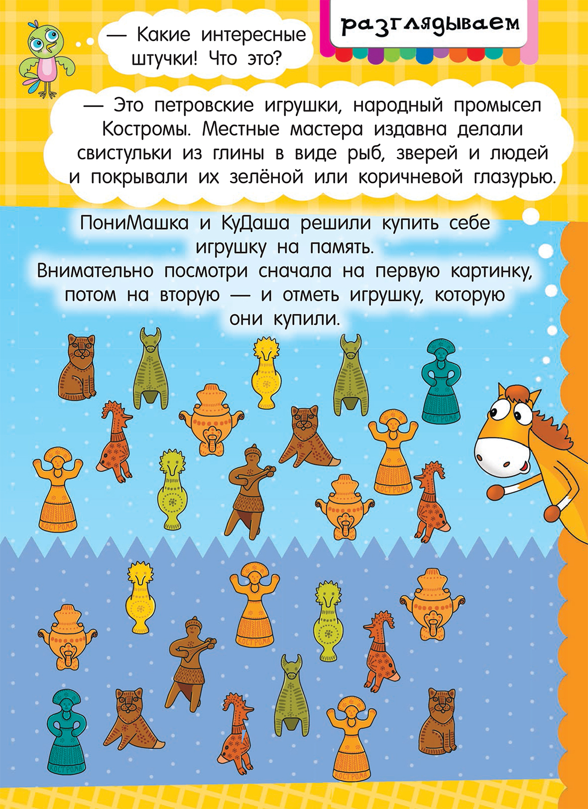 ПониМашка и Кудаша отправились на ярмарку в городе Кострома и увидели там маленькие фигурки. Это оказались петровские игрушки, народный промысел Костромы. Местные мастера издавна делали свистульки из глины в виде рыб, зверей и людей и покрывали их зелёной или коричневой глазурью. ПониМашка и КуДаша решили купить себе такую игрушку на память. Внимательно посмотрите сначала на первую картинку, потом на вторую — и отметьте игрушку, которую они купили.