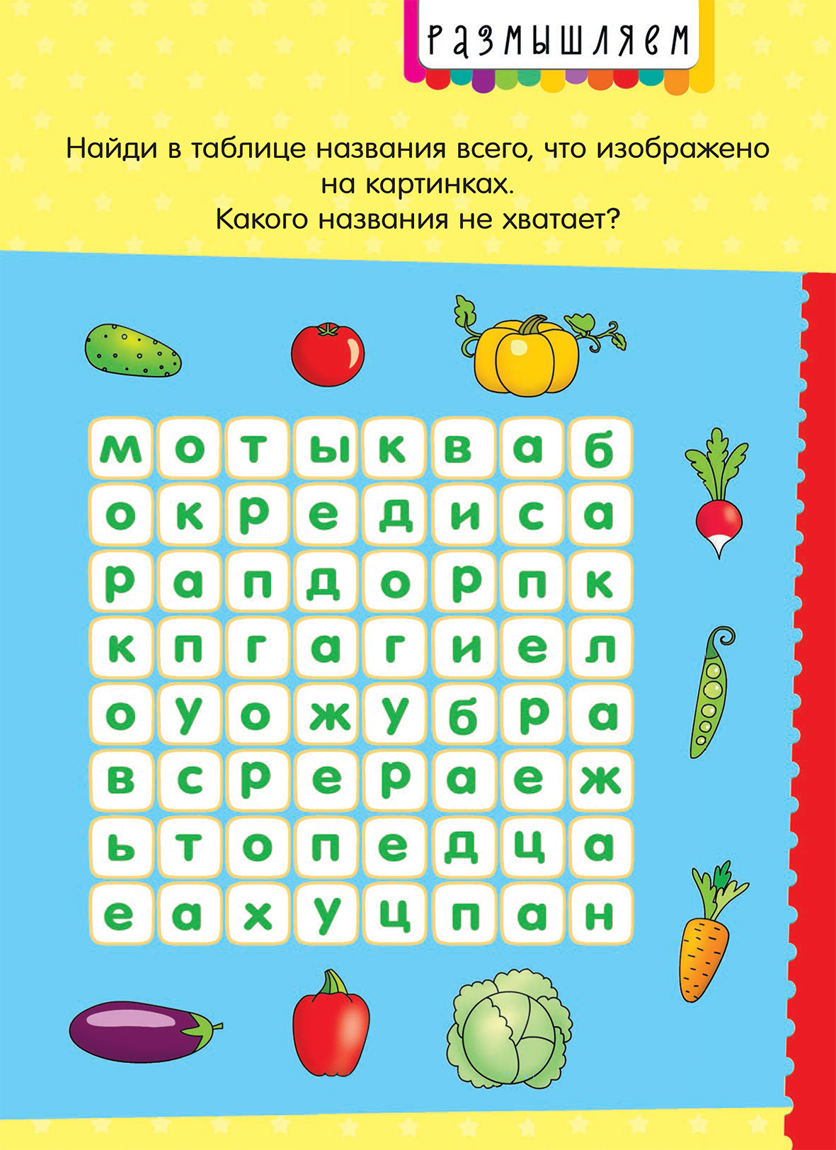 Если ребенок уже знаком с буквами и умеет составлять их в слоги, то можно попробовать разгадать нашу головоломку. В таблице мы спрятали названия овощей. Их надо найти в таблице и узнать, какого названия не хватает.