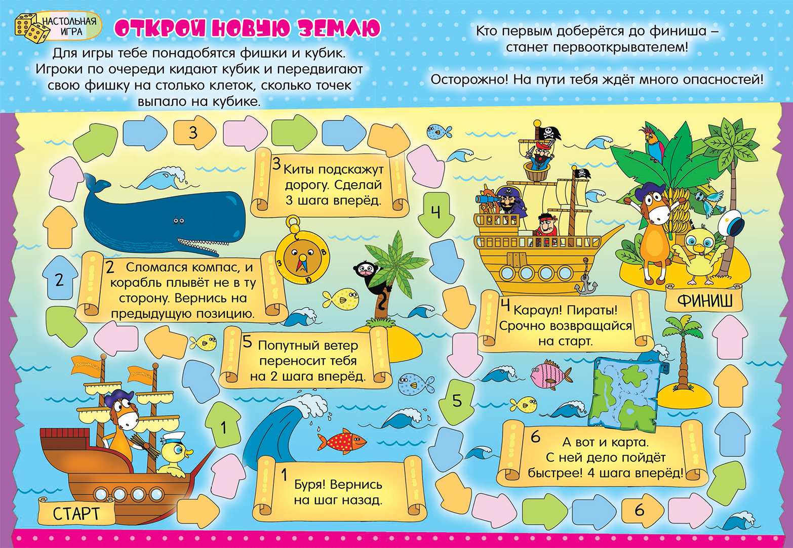 Игра — важный элемент занятий с ребенком: она развивает внимание, логику и воображение в нестандартной и веселой форме. А еще это отличный способ провести время вместе всей семьей. Для данной игры вам понадобятся фишки и кубик. Кидайте его с малышом по очереди и двигайте свою фишку на столько клеток, сколько точек выпало на кубике. Кто же из вас станет первооткрывателем таинственной земли?
