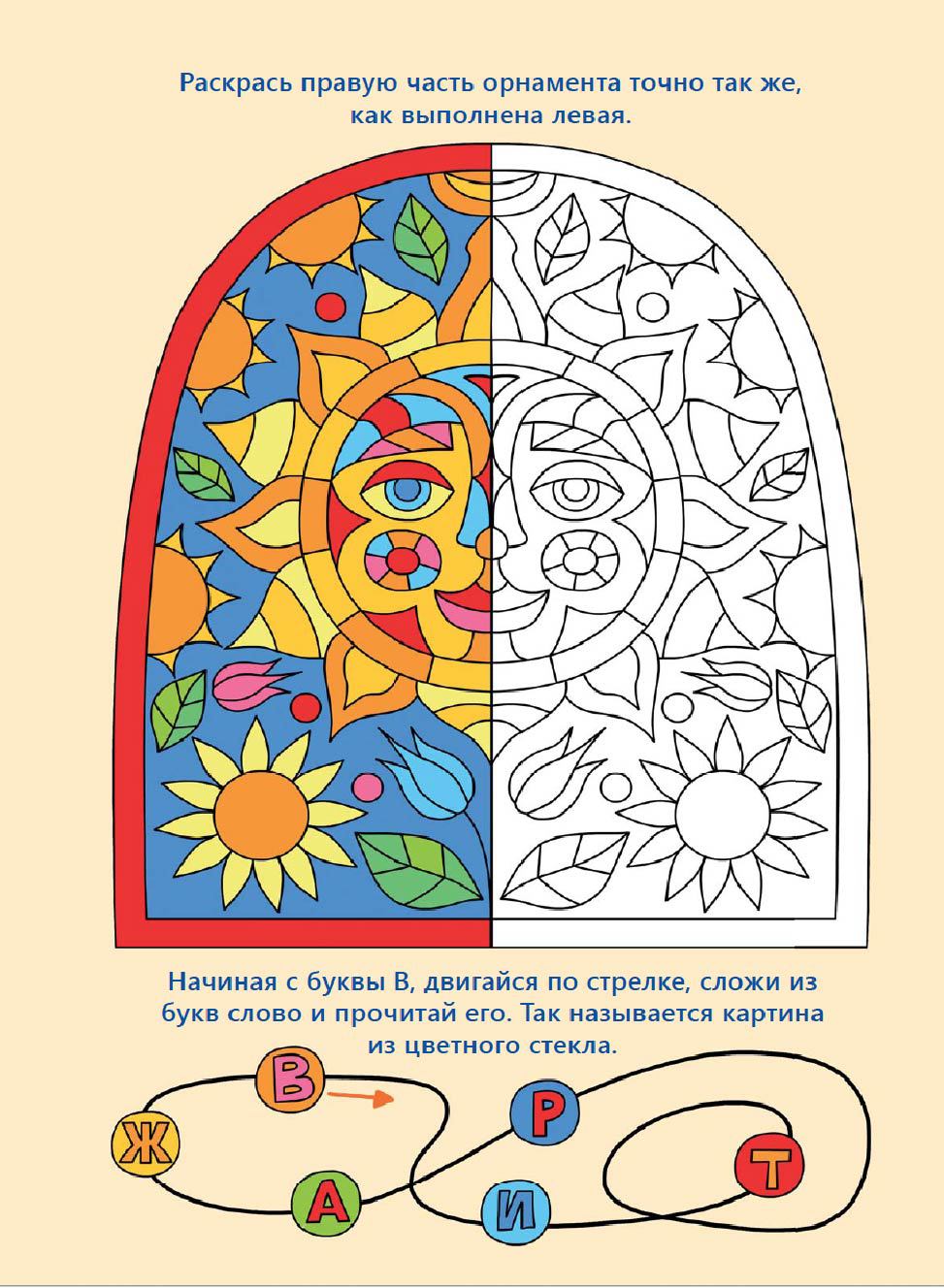 Перед вами не простая картинка, у нее есть специальное название, которое зашифровано внизу страницы. Двигайтесь по стрелочкам и вы узнаете, как называется картина из разноцветного стекла.