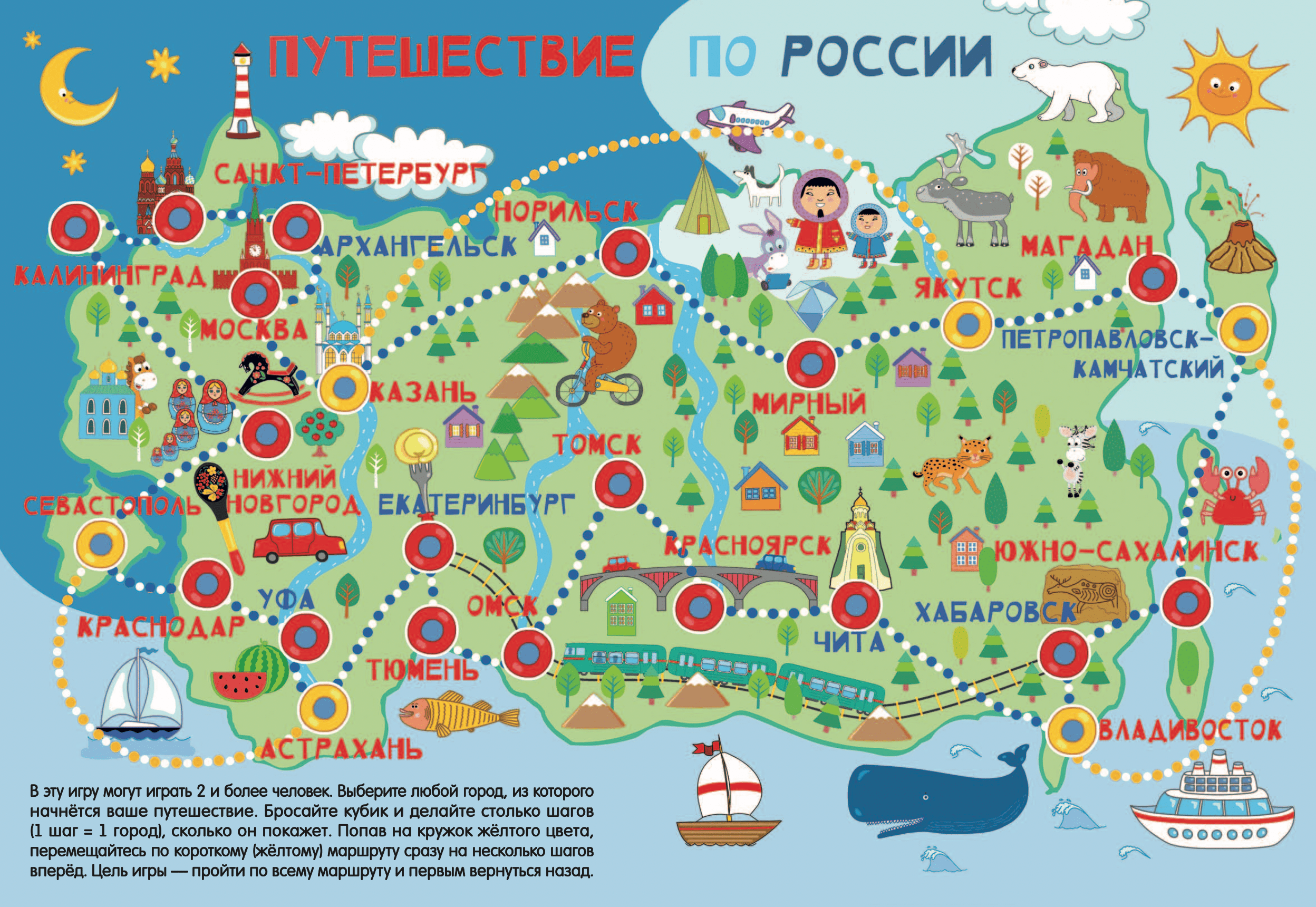 В эту игру могут играть 2 и более человек. Выберите любой город, из которого начнется ваше путешествие. Бросайте кубик и делайте столько шагов (1 шаг = 1 город), сколько он покажет. Попав на кружок желтого цвета, перемещайтесь по короткому (желтому) маршруту сразу на несколько шагов вперёд. Цель игры — пройти по всему маршруту и первым вернуться назад.