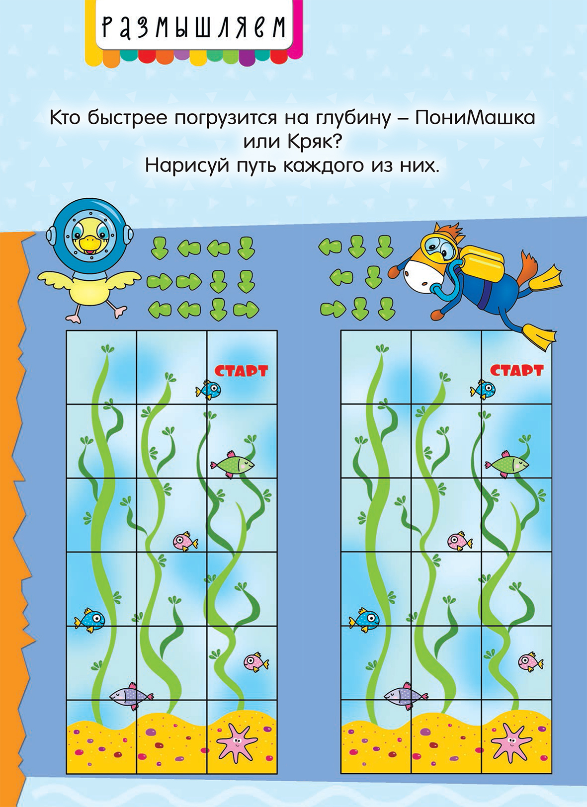 Комбинированное задание на подготовку руки к письму и развитие логического мышления. Ребенок должен нарисовать маршруты движения ПониМашки и Кряка из исходной точки «Старт», следуя указаниям стрелок. Сравните, чей путь на глубину по итогу оказался короче. Вспомните с малышом понятия «Больше – Меньше», «Длиннее – Короче». Для удобства выполнения задания картинку можно распечатать.