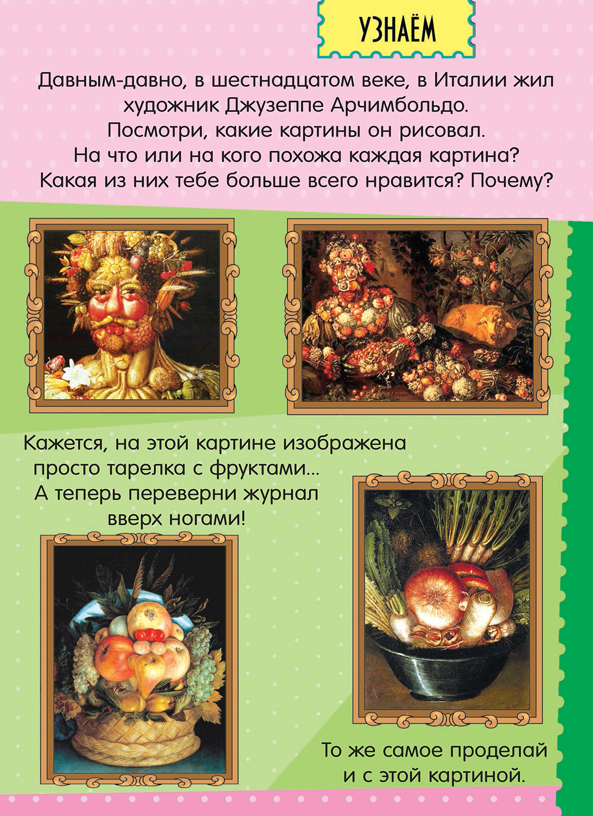 Давным-давно, в шестнадцатом веке, в Италии жил художник Джузеппе Арчимбольдо. Посмотрите, какие необычные картины он рисовал. Обсудите с ребенком, на что или на кого похожа каждая картина? Какая из них больше всего нравится? Почему?